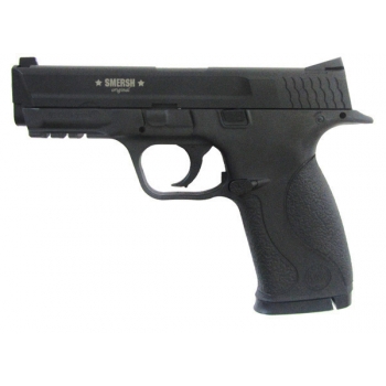 Удобный в эксплуатации, надежный и доступный по цене газобаллонный пистолет Smersh H58 является полным аналогом знаменитого SW MP. Обладая прицельной дальностью в 10 метров при начальной скорости заряда в 100 м/с, он отлично подойдет как опытным стрелкам для развития своих профессиональных способностей, так и новичкам, послужив инструментом к познанию азов обращения с оружием. Эргономичный каркас Smersh H58, выполняется из металла и ультрапрочного пластика. Надежная система автоматического взведения курка и относительно небольшой вес (700 гр.) превращают стрельбу в комфортный процесс, от которого каждый стрелок получит удовольствие. Оснащен пистолет металлической обоймой, вмещающей 19 стальных шариков калибра 4,5 мм и баллончиком, заполненным углекислым газом, массой в 12 гр. Стрельба производится посредством вытеснения заряда через ствол, потоком СО2 при высоком давлении. Энергия пули для Smersh H58 достигает 3 Дж, что является достаточно серьезным показателем в данной оружейной категории.